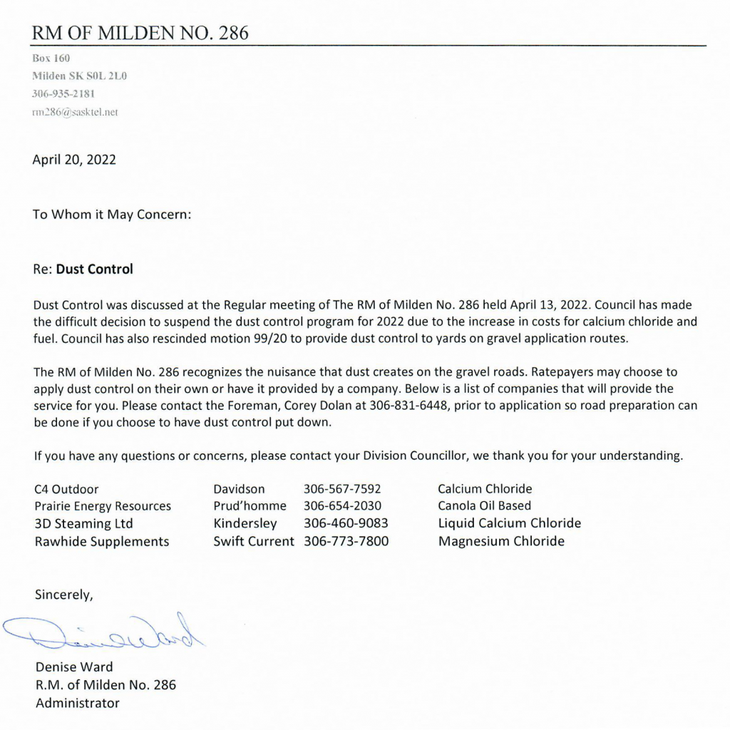 Provincial Road Restrictions: Depending on local weather and road conditions, the RM of Milden No. 286 may opt in or out of Provincial Spring Road Restrictions. Please refer to the Ministry of Highways website for maps and information.